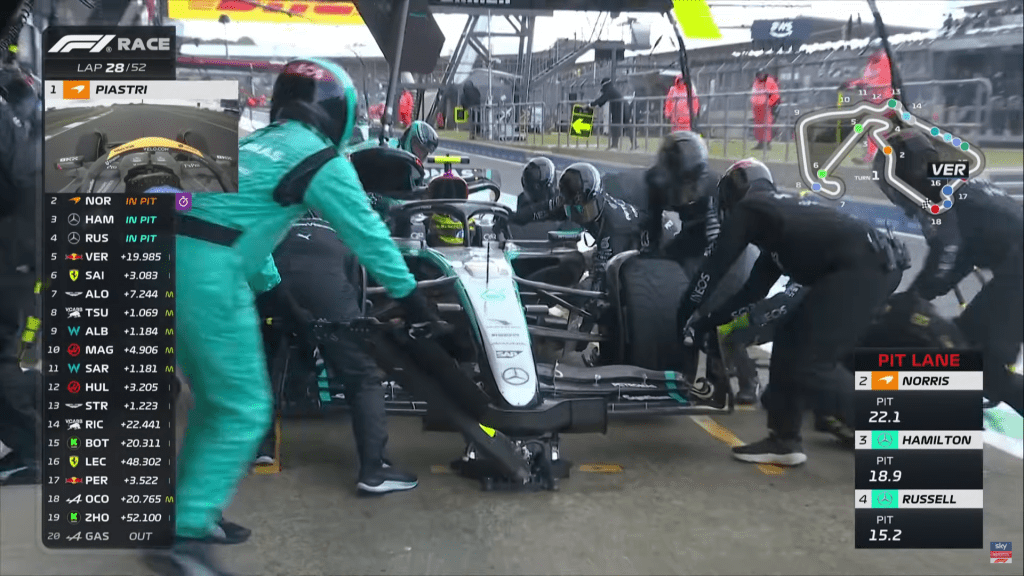 Norris pitted a lap later, and the British crowd waited in anticipation to see which home favourite would emerge from the stops in the lead.