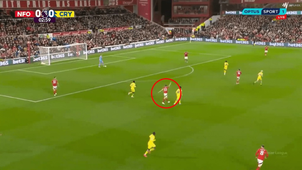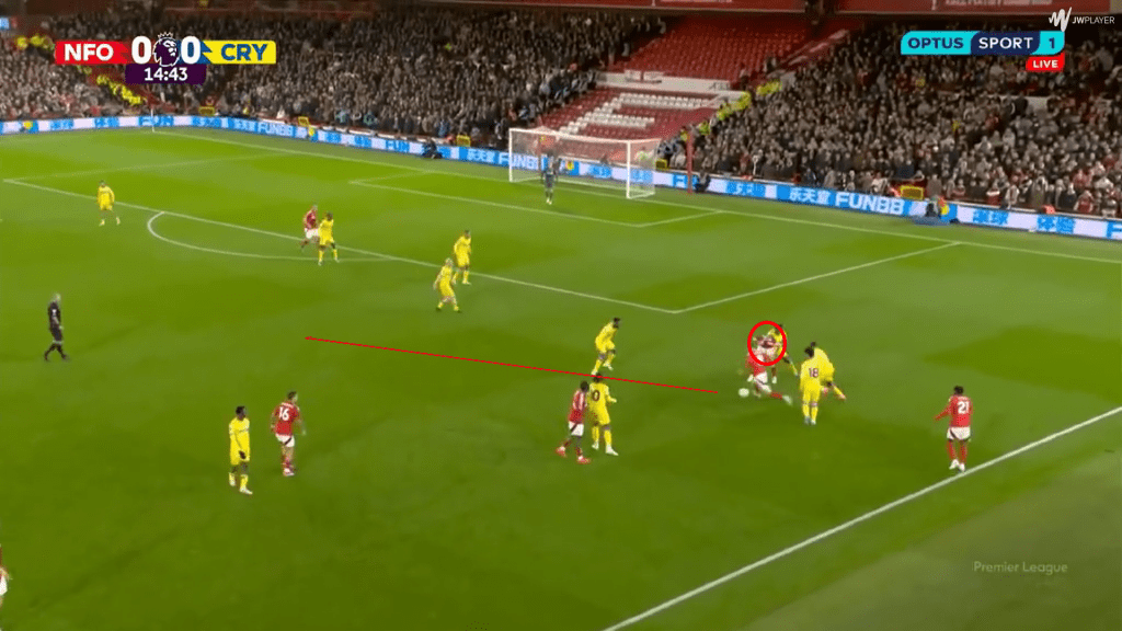 The same is evident here: Anderson receives the ball in a tight space and dribbles out of it well – but his job is made significantly more manageable by Yates acting as a shield and delaying two Crystal Palace players.