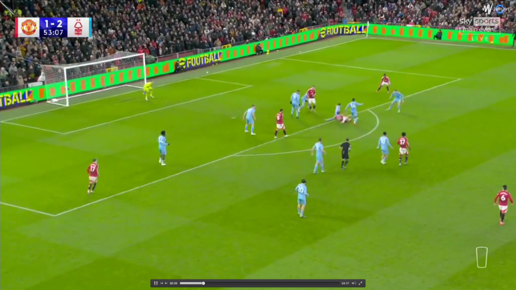 What this demonstrates is that Yates’ unselfish nature leads to his teammates having more space and opportunity. He frequently makes these dummy runs – dropping into positions that allow Ola Aina time on the ball, or creating openings for more creative midfielders Morgan Gibbs-White or Anderson as shown.