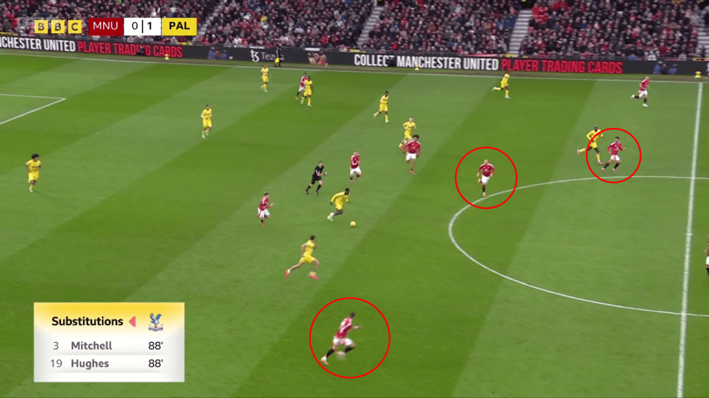 It is also clear for Palace’s second goal. As much as United were chasing the game at this point, Joshua Zirkzee’s loose pass should trigger United to either counterpress to try and win the ball back high up the pitch, or drop off to limit Palace’s options.