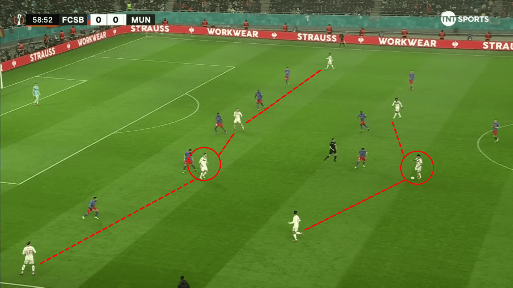 This is evidenved above, with Lisandro Martinez (in possession) holds the ball high up the pitch, presenting Fernandes with space to run into, and allowing four United players to put pressure on FCSB’s defence.