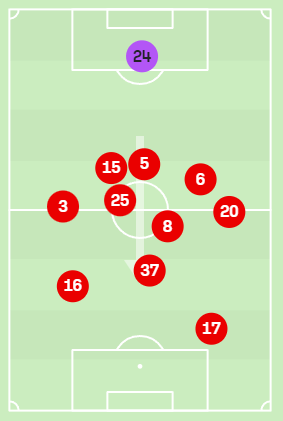 But in practice, as evidenced by Mainoo’s average position (number 37 above), he was left largely isolated for periods of the game. This can be contrasted to Jean-Phillipe Mateta (Palace number 14), whose positioning close to the midfield constantly offered the visitors an outlet.