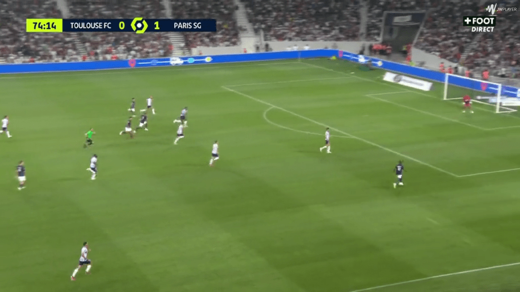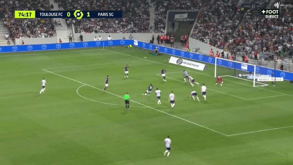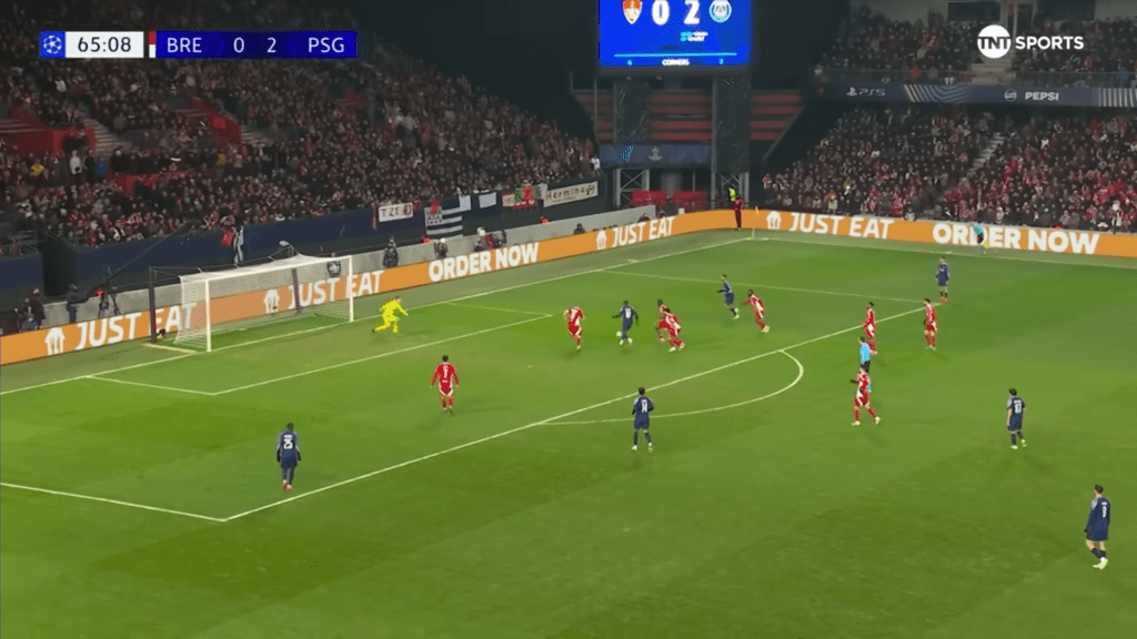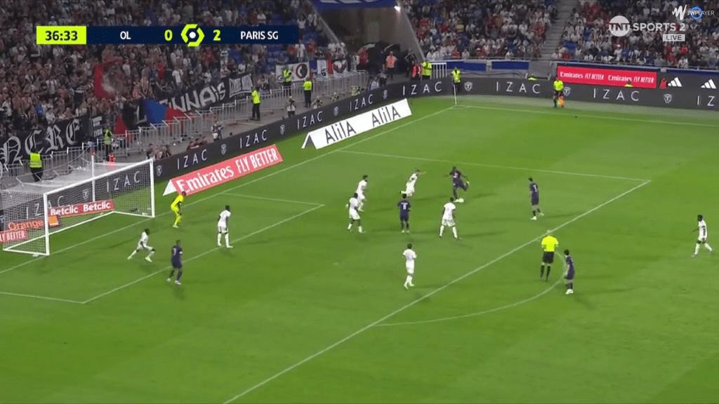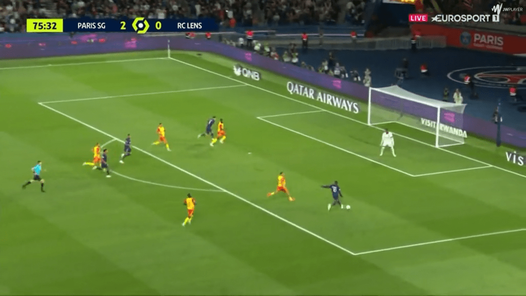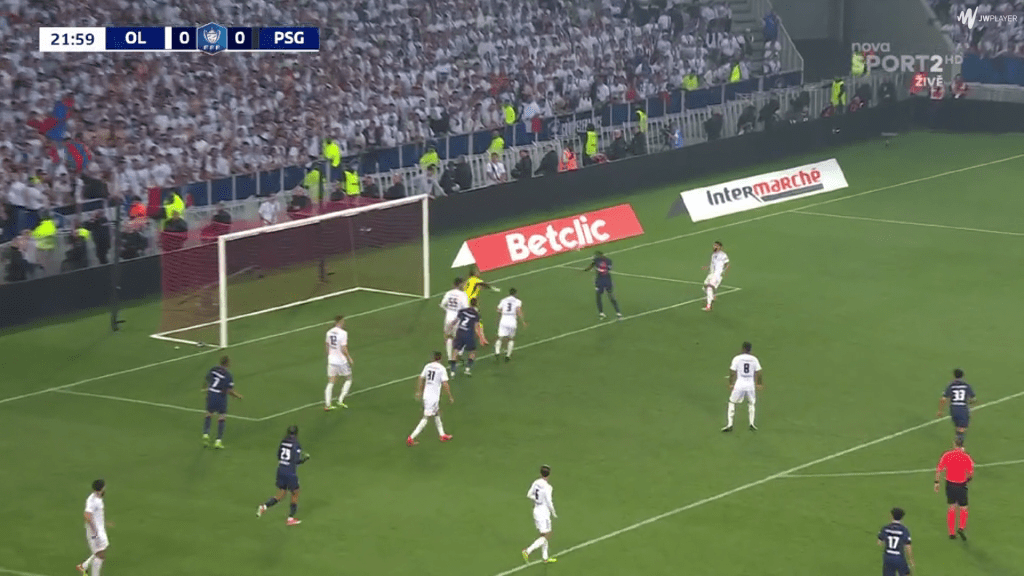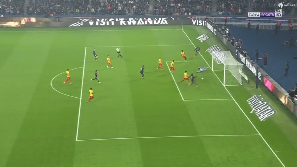 His second shot was frustrating for another reason. Again, Dembele had picked up the ball on the right, and had space to run into. But this time, he chooses to stay wide rather than cutting in. For someone as two-footed as Dembele (he has had exactly 50 shots on each foot since joining PSG), this isn’t an issue.
