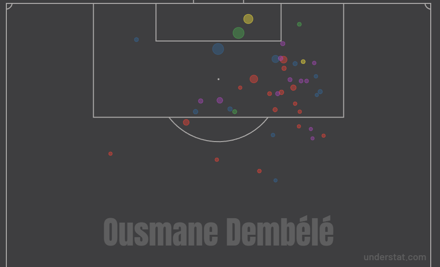 It should go without saying, but taking more shots from more threatening areas, and less from unlikely areas, would lead to any forward scoring more frequently. Dembele has clearly worked with PSG to create more of these high-probability shots, and he is reaping the rewards.