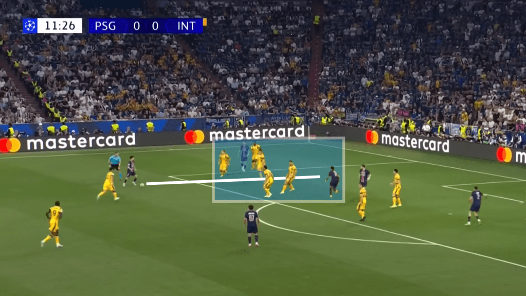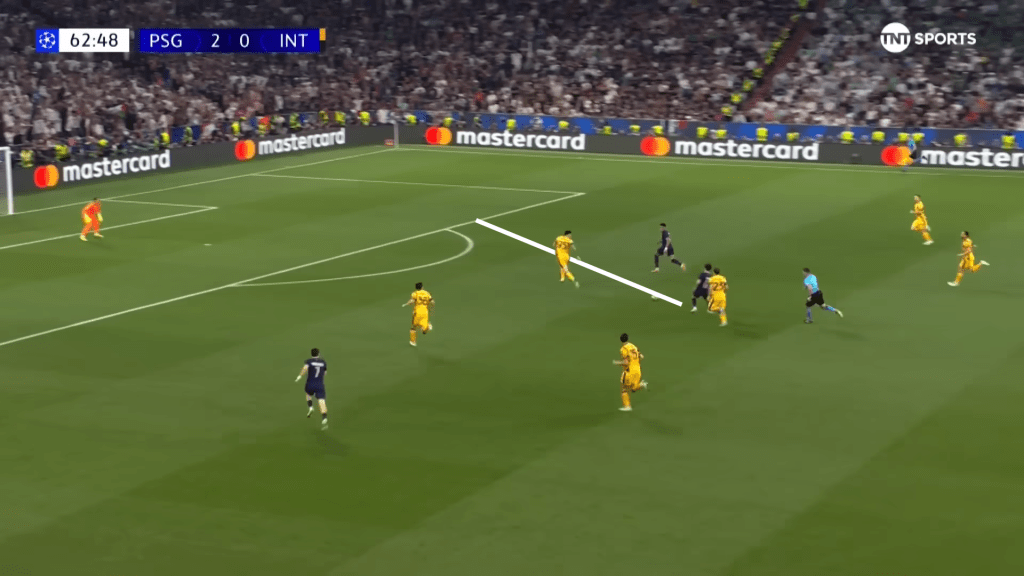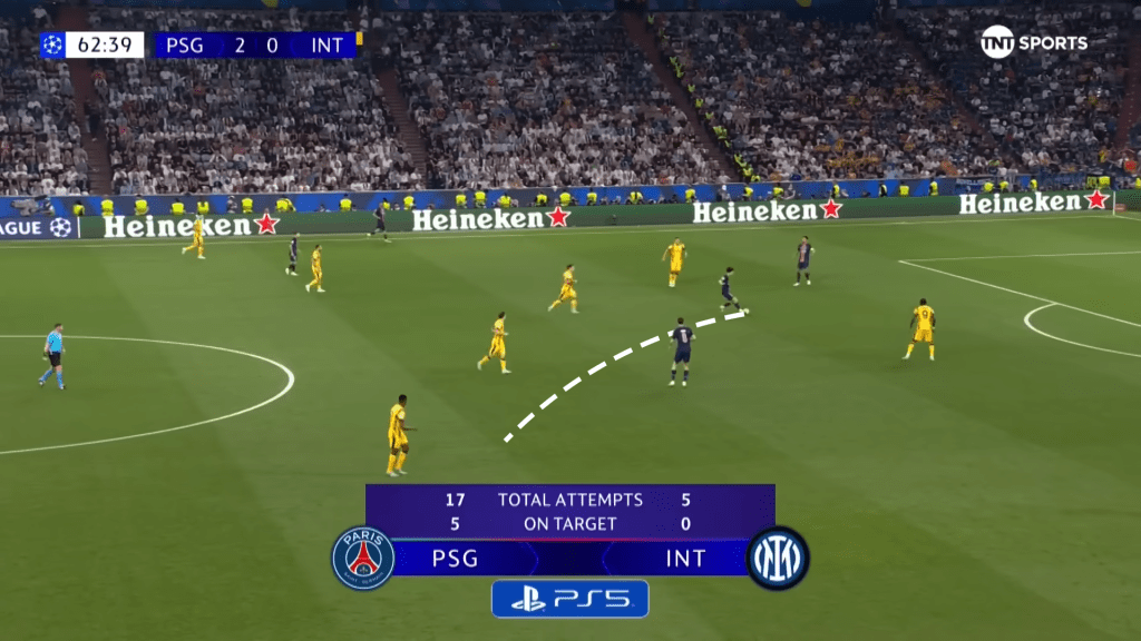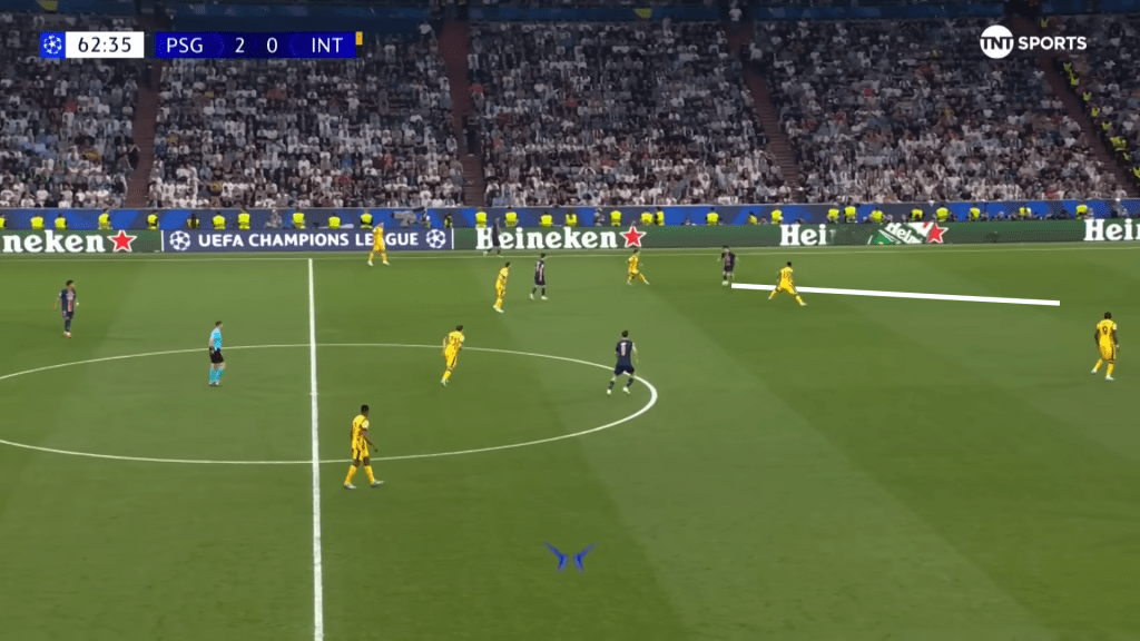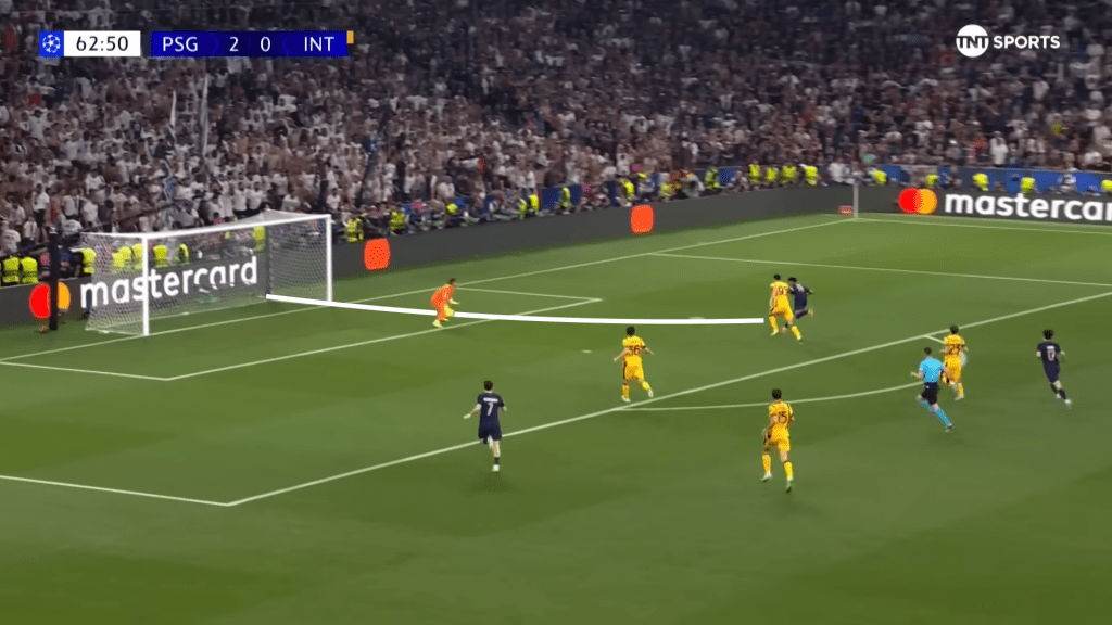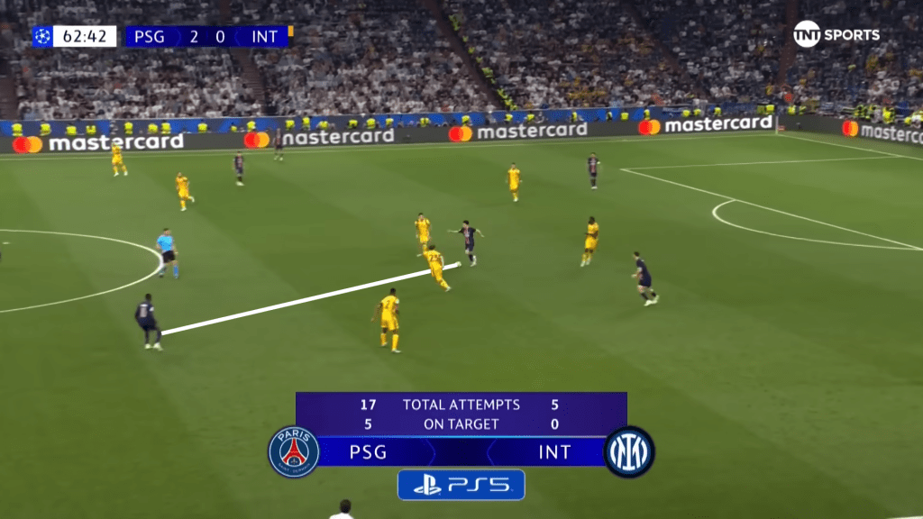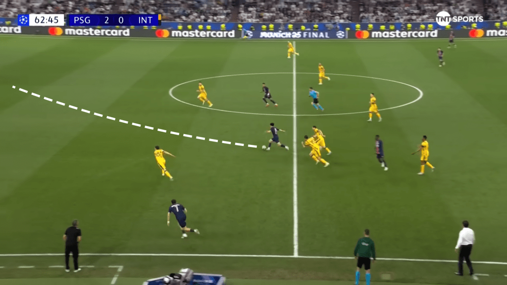For Vitinha to receive the ball where he does and somehow see the pass into Doue is nothing short of world-class. He has found the smallest pocket of space, gone entirely against what Inter were anticipating, and opened up the whole game for his side.