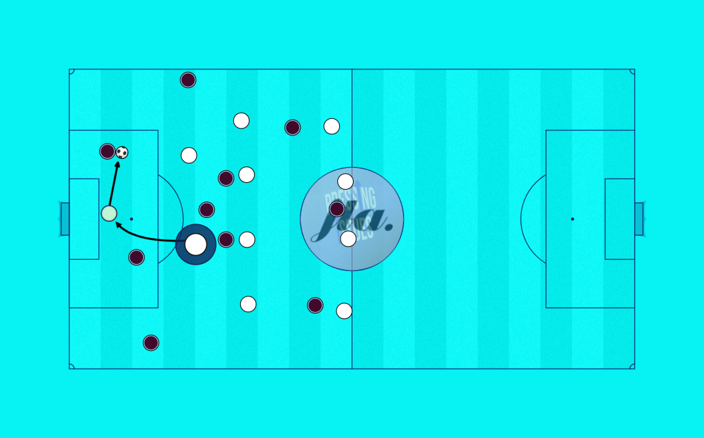 In the high press phase, many teams will look to essentially cut the pitch in half: going P2P on one side of the pitch to limit the ball carrier’s options.