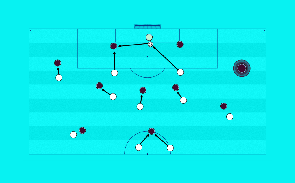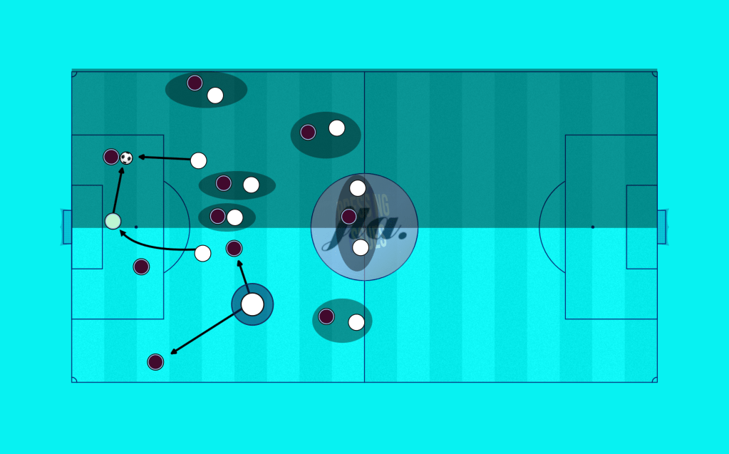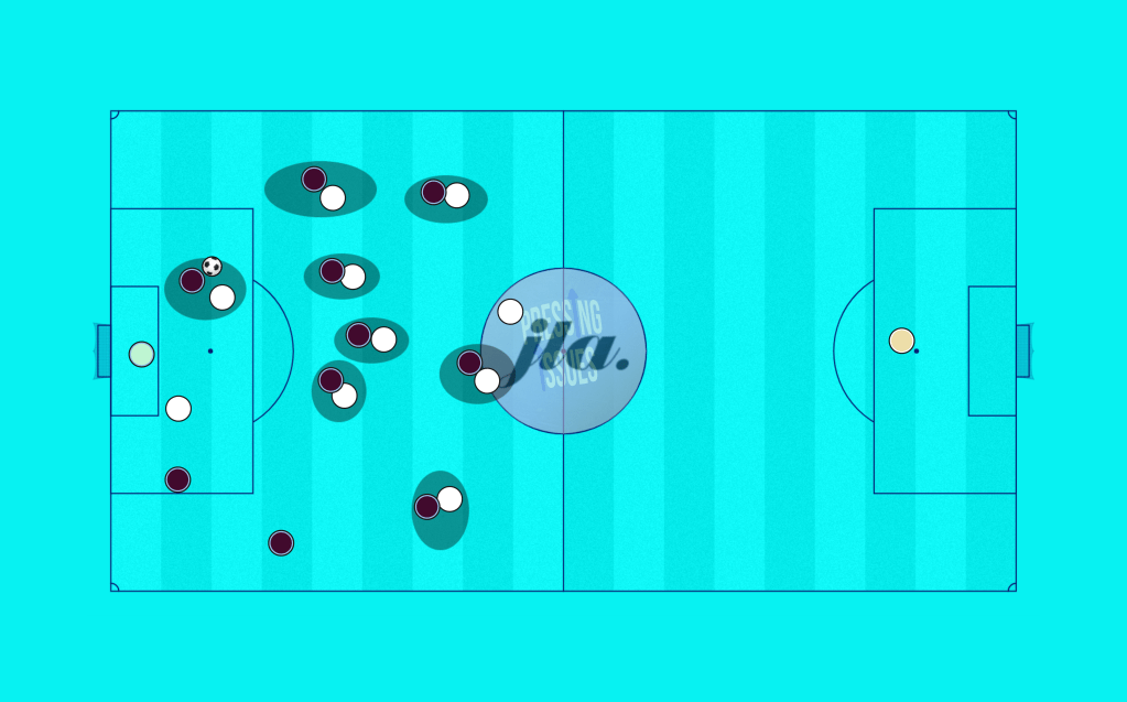 But the high press phase itself holds the same weakness as a usual high press: the opponent always has a spare player. This is what Guardiola at City and Frank at Spurs try to combat with having their hybrid player switch between the two depending on the ball’s position. It leaves one of the opponent’s defenders free, but retains the shape to transition into a midblock as and when it’s required.