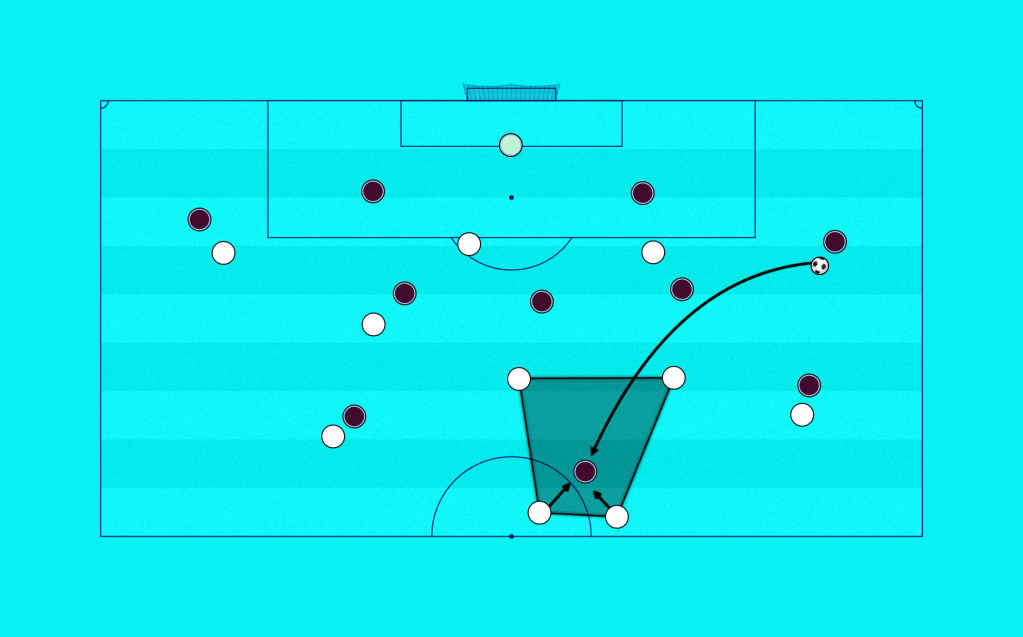 This pressing style, when done effectively, can make the team in possession feel strangled. It forces them to either play high-risk passes to attempt to play through the press and potentially exploit the space left behind the OOP team, or, as is more often the case, play the ball long and forwards, where the OOP team have a 4-3 advantage (owing to most teams keeping their centre-backs doubled up on the opponent’s striker).
