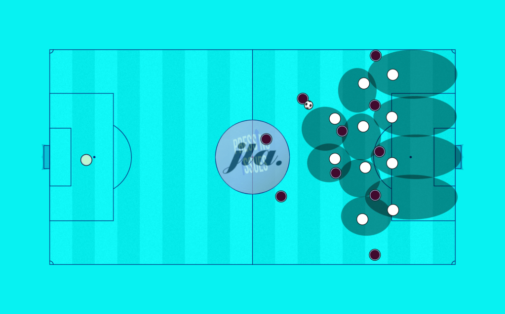 Of course, both scenarios also have other benefits. By going P2P and limiting the opponent’s time in possession, they also protect space by preventing the ball from being played forward. Similarly, in a zonal system, there may be areas of the pitch where the opponent would be pressed aggressively if they entered it – thus protecting possession in these areas.