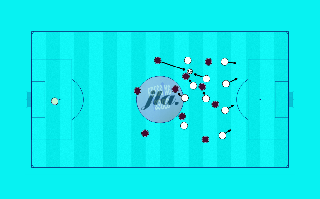 The danger of a hybrid press comes in these transitional moments, when the team is shifting from one side of the pitch to the other. As such, it is moments like these that teams might shift into a midblock and look to re-establish their high press phase from there.